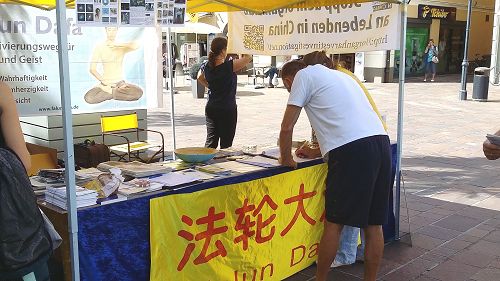 二零一四年八月二十九日,奥地利法轮功学员在位于奥地利凯尔滕州的首府城市克拉根福举行信息日,向当地民众和到此地的游客揭露中共迫害法轮功的暴行。