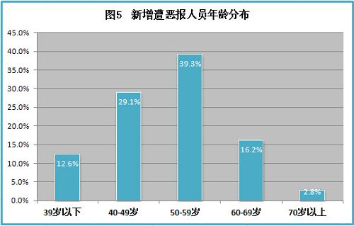 在2013年新增遭恶报案例中,有年龄记载的247人。其中,39岁以下年龄段,遭恶报的有31人,40-49岁年龄段有72人,50-59岁年龄段有97人,60-69岁年龄段有40人,70岁以上有7人。