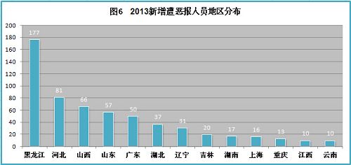 在遭恶报人员中,人员分布在26个省市区中。其中黑龙江177人,河北81人,山西66人,山东57人,广东50人,湖北37人,辽宁31人,吉林20人,湖南17人,上海16人,重庆13人,江西10人,云南10人,等等。如表5和图6所示。