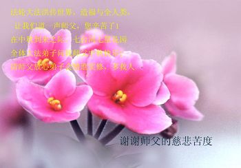我们是2013年得法的新学员,时间过的真快,转眼都一年多了,在这一年多里分分秒秒都离不开师尊的慈悲看护!让我们有了一个健康的身体,让我们的心灵得到了升华,谢谢慈悲的师父救度,弟子想念远离家乡的师父!