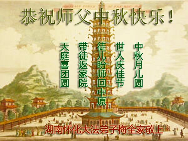 “海上生明月,天涯共此时。每逢佳节倍思亲。”在这中华民族传统的中秋佳节即将来临之际,我们全家人向尊敬的李大师祝贺,祝您及您的家人中秋节快乐!万事如意! 我们盼望大师早日回来,与可贵的中国人团聚,我们好人一定会等到那一天的到来,一定会的!