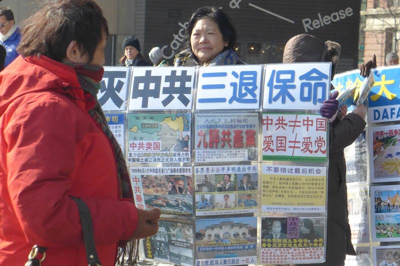 今年冬天华盛顿DC的天气异常寒冷,冰雪天气比往年更多,但大陆游客和往年相比,不减反增。公费旅游的官员少了,扶老携幼的普通游客增多了。很多游客一下车,就迫不及待的来到真相点,站在横幅前面拍照;也有些人大声的念着:“没有了共产党,中国才有希望”“中国不等于中共”,有人说:“对,这可都说到我心里去了!”