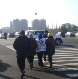 ![]() 李美玲老母亲(穿状衣)和婆婆去市公安局的路上 |