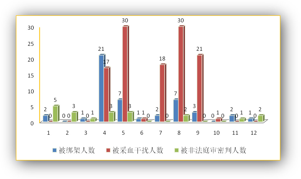 2014年4月至8月  黔西县  18人(王明芬、彭世芬、燕顺芝、张德荣、夏万贵、周顺英、苏贵荣、苏世伦、梅兰芳、胡老三、龚碧仙、李华芬、薄云珍、刘国珍、刘永仙、周文顶、两名常人胡方林、刘景进)  黔西县各派出所  多人  被强制抽血