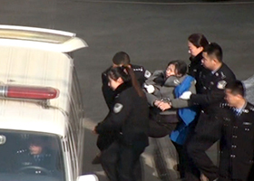 一排警车嚎叫着,一辆法院面包车里面“押着”一个身体极度虚弱的中年女子,她躺在法院面包车后部的地板上,双目紧闭,被戴着手铐……车在法院后门停下后,警察将她抬进了法庭。