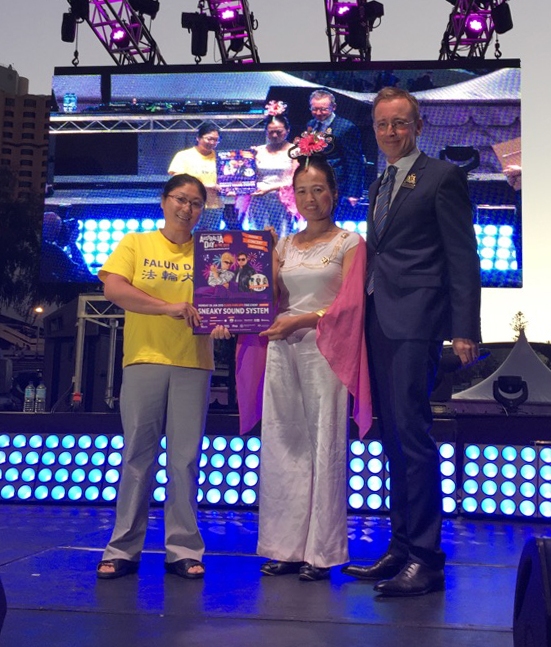 南澳州阿德雷德市长赫斯(Martin Haese,右)给再次获得最具创意奖的南澳法轮功团体颁发奖状。