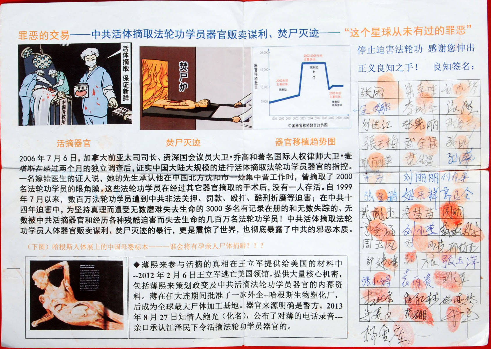 一次在集市上,一位不到四十岁的女士,老远就说,“大姐给我点资料,以前你们在村里给我退过,但我看过你们拿的征签表我没有签名,回家后看你们给的资料,我才明白,我坚决谴责活摘,今天老远看到你们在给别人讲,大冷天我等了你们好久了,我也要签名。”签名后,由于手太凉,很难打开印泥,可她坚持按手印。