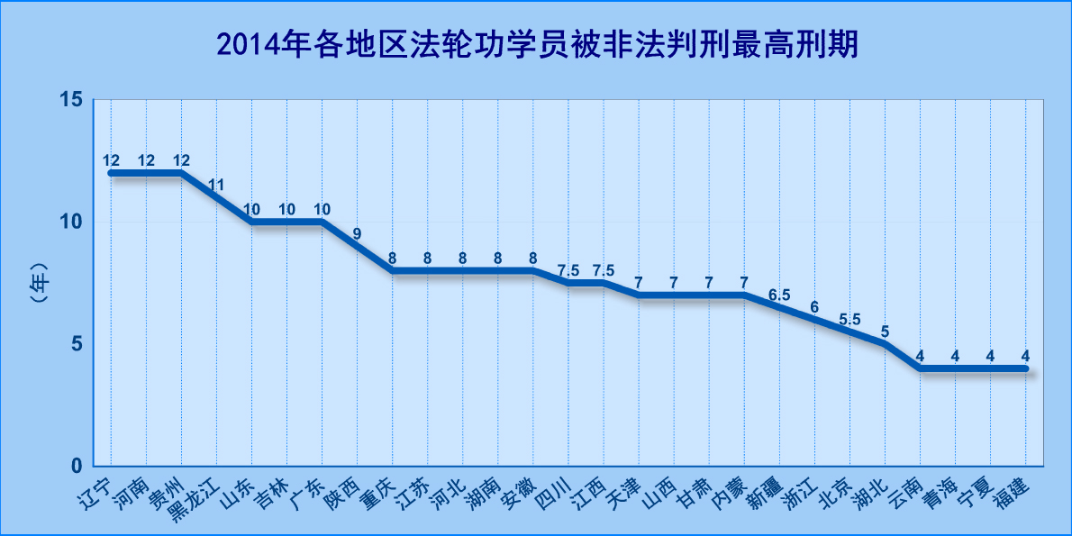 2014年法轮功学员被非法判刑最高刑期为12年,出现在辽宁、河南、贵州。法轮功学员被非法判刑八年(含)以上的有26例,分别是: