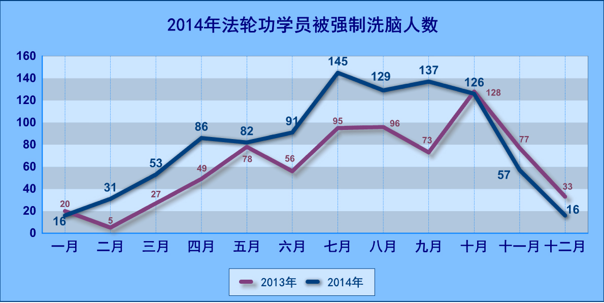据截至2015年1月4日的明慧网讯息统计:2014至少有九百六十九名大陆法轮功学员被强制洗脑。其中:一月份16人,二月份31人,三月份53人,四月份86人,五月份82人,六月份91人,七月份145人,八月份129人,九月份137人,十月份126人,十一月份57人,十二月份16人,共969人,如下图所示。