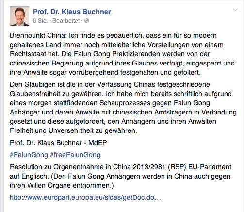 布赫讷议员还在脸书上公布了欧洲议会于二零一三年十二月十二日通过的关于中共活摘器官的决议,其中明确指出了中共活摘法轮功学员人体器官的罪行,并呼吁释放所有的法轮功学员和保证他们的信仰自由。