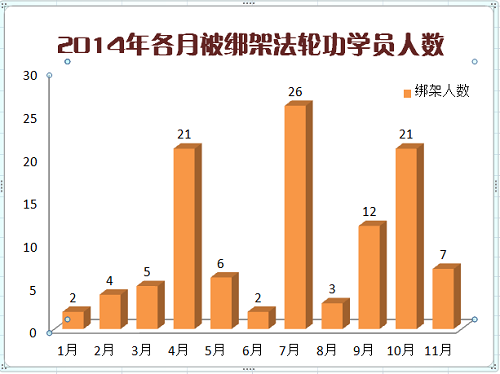 二零一四年七至十二月份大连地区绑架法轮功学员六十九人,全年累计绑架一百零九人次。