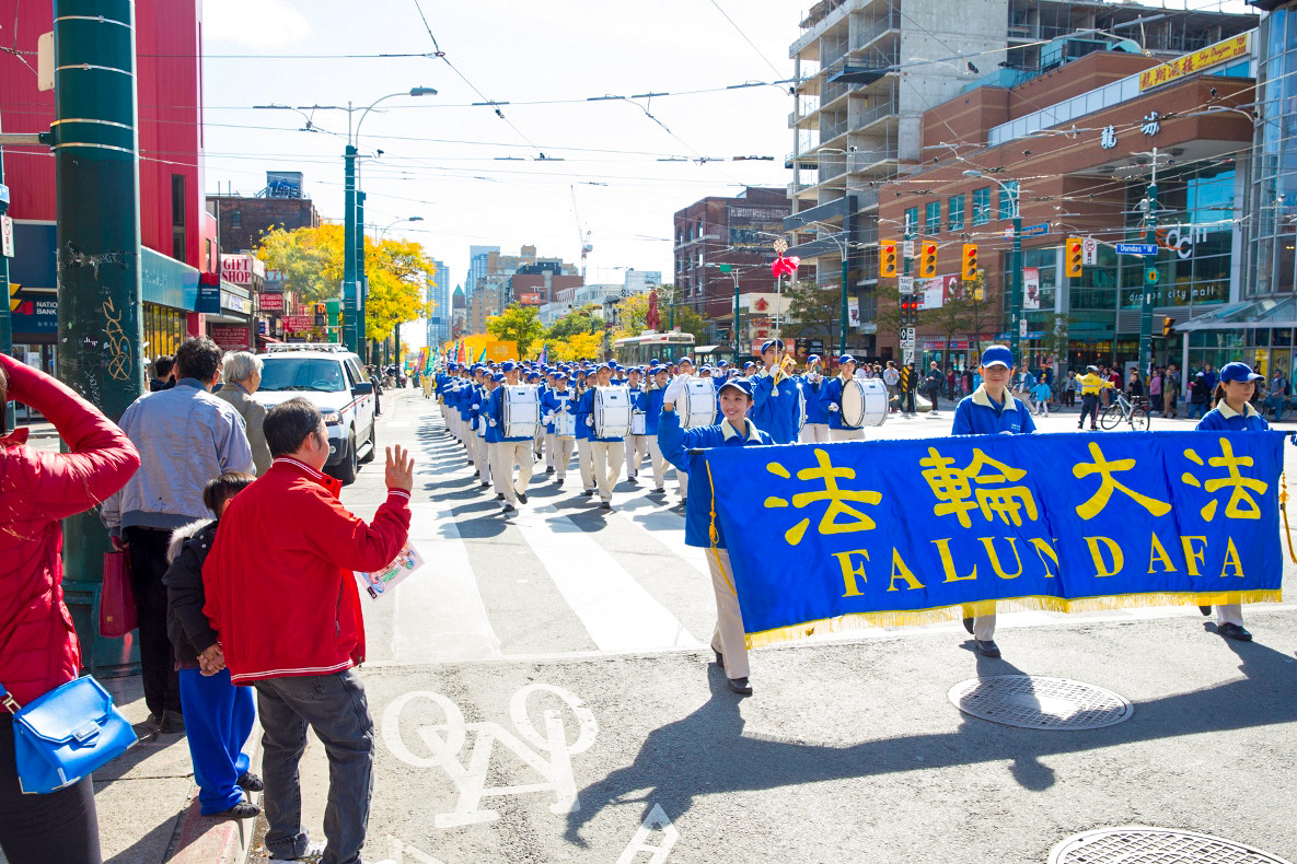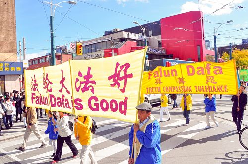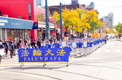 【明慧网二零一五年十月十二日】(明慧记者章韵多伦多报道)十月十日中午,加拿大多伦多法轮功学员在市中心举行第二次诉江大游行,游行分天国乐团、“法办江泽民”、“法轮大法好”,“停止迫害”和“声援两亿人退党”等方阵,队伍从市中心Clarence公园出发,途经中区唐人街,市政府广场,经过市中心最繁忙的几个大的十字路口,历时近两小时,所到之处引起民众的关注。很多民众表示支持,并在制止中共活摘法轮功学员器官的请愿信上签名。