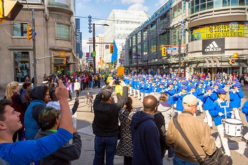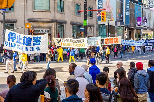 图1-9:二零一五年十月十日中午,多伦多法轮功学员在市中心举行今年诉江以来的第二次诉江大游行,所到之处引起民众的关注,很多民众表示支持并在制止活摘的请愿信上签名。