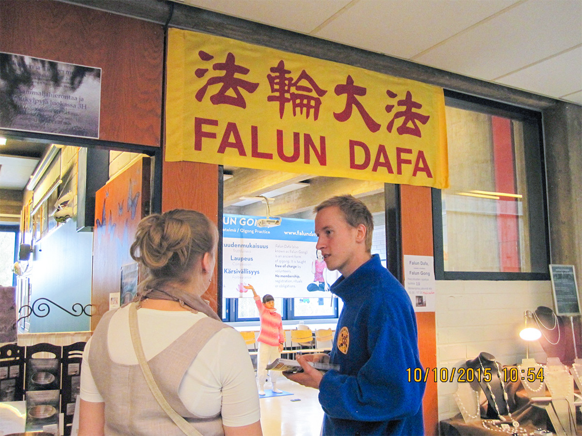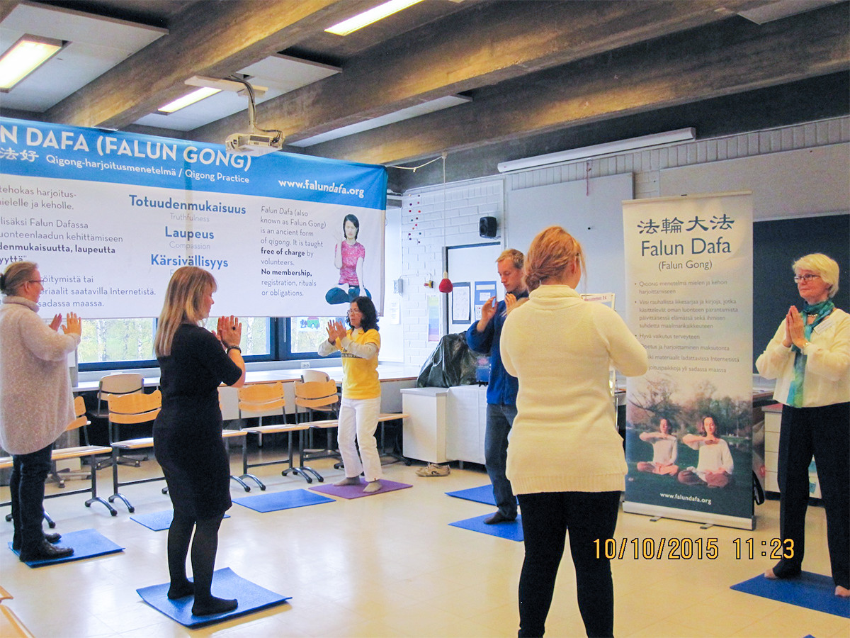 【明慧网二零一五年十月十二日】二零一五年十月九日,在芬兰的赫尔辛基芬兰中学(Helsingin Suomalainen yhteiskoulu)里,当地法轮功学员举办了为期两天的活动,介绍法轮功功法。十月十日和十一日,法轮功学员们又参加了在芬兰举办的健康博览会,让更多地有缘人了解法轮功。
