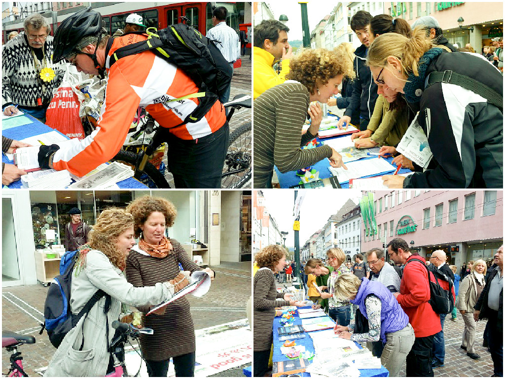 ![]() 图1-3:在德国名城弗莱堡繁华的市中心的法办江泽民的请愿征签桌前,德国民众经常排队或几个人同时签名,表达他们的支持 |