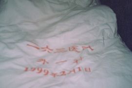 不一会又过来两个人,他们六个人将我扔在急诊床上,胖子骑在我肚子上,两人一人按住一条腿,两个一人按住一条胳膊,一个人按住头。因为我不停的挣扎,胖子又打了几下子。女医生开始插管子,我不停的喊:“师父!——师父!”左右鼻孔、口腔各插两次,每次拔出管子都带出很多血,都没能插到胃里去。从嘴里插管时,恶人怕咬住管子,就捏住鼻子,趁呼吸张嘴时插管,可还是没插进去。这时,一个人说:“连鼻子带嘴一块插!”