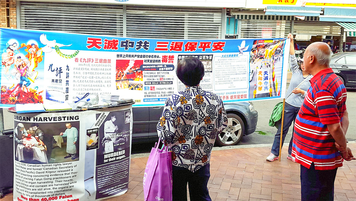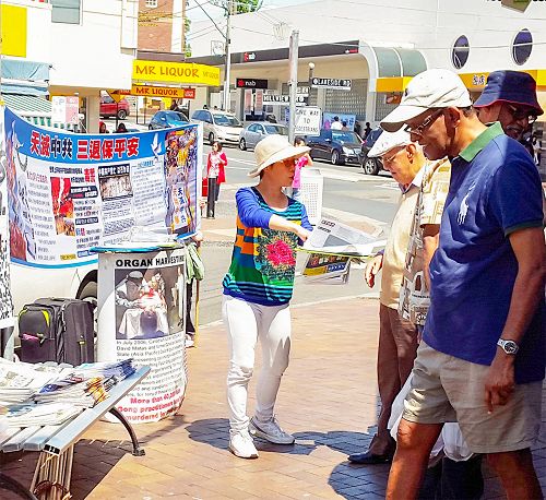 【明慧网二零一五年十月十三日】(明慧记者华清澳洲悉尼报道)二零一五年十月十日,法轮功学员在悉尼华人聚集地伊士活(Eastwood)举办真相图片展活动,揭露中共活体摘取法轮功学员器官的罪行,并征集制止“活摘”和声援“诉江”(起诉迫害法轮功的元凶江泽民)的签名,当地民众不但签名支持,还主动传播真相,希望更多的民众一起来支持法轮功“反迫害”。
