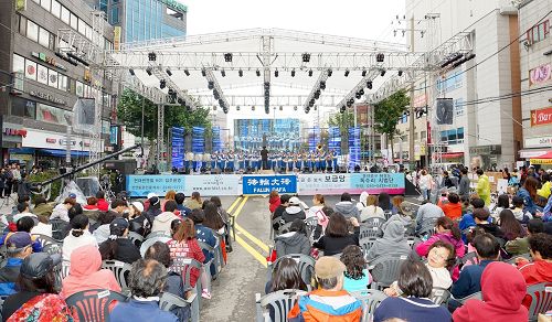 演奏开始时,主持人向观众介绍说:“天国乐团是由身心修炼团体法轮大法学员组成,他们来自社会不同文化阶层。法轮大法是以宇宙最高特性‘真、善、忍’为根本的历史悠久的正统身心修炼法。”并详细介绍了天国乐团曾在韩国举行的众多活动中多次获奖的历程。