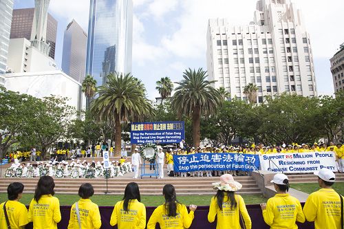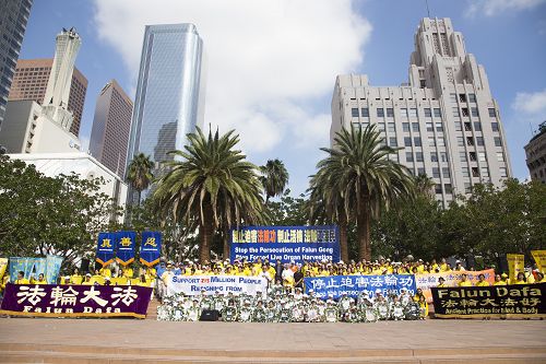 图:法轮功学员在洛杉矶市中心潘兴广场(Pershing Square)举行主题为“制止迫害法轮功、制止活摘器官、法办江泽民”的公众集会。