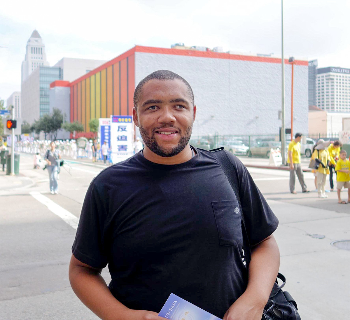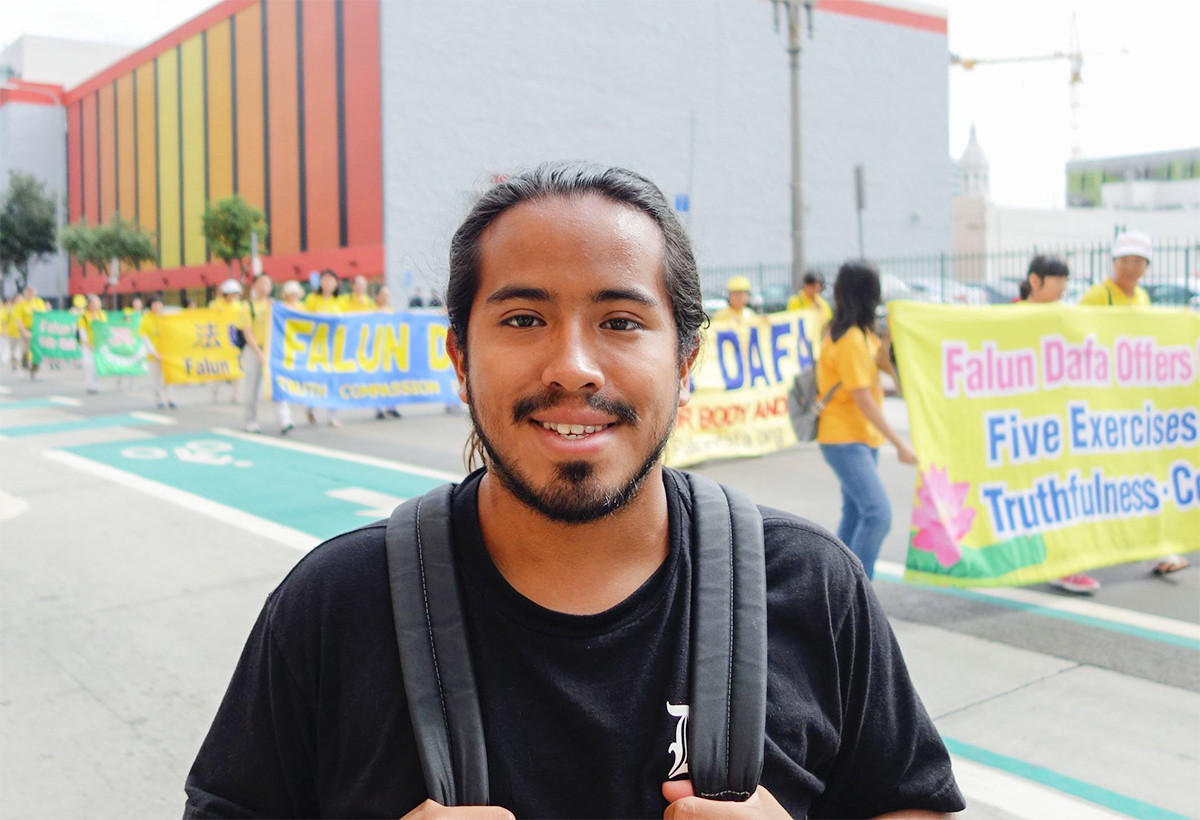 一位身材魁梧、说话充满活力的男子接到传单后,询问这是什么游行。得知法轮功在中国受到迫害的事情,住在洛杉矶附近的他表示曾经听过,并关切地问说,这场迫害持续了多久?这件事到现在还持续吗?听到这场迫害已经持续十六年了,他感慨说这真是一件疯狂的事。在得知是因为炼功的人数太多而遭到江泽民与中共非法镇压时,他表示不可思议,希望自己能为制止迫害尽一份心力。