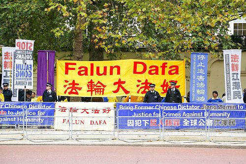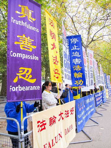 【明慧网二零一五年十月二十一日】(明慧记者唐秀明英国伦敦采访报道)二零一五年十月二十日,是中共领导人习近平访英活动的第一天。法轮功学员在白金汉宫前的林荫路(The Mall)上和英国议会大厦前打出“法轮大法好”、“停止迫害法轮功”和“法办江泽民”等横幅,并进行集体炼功,发真相传单,征签反迫害,劝中国人三退(退出中共党、团、队,简称三退)。
