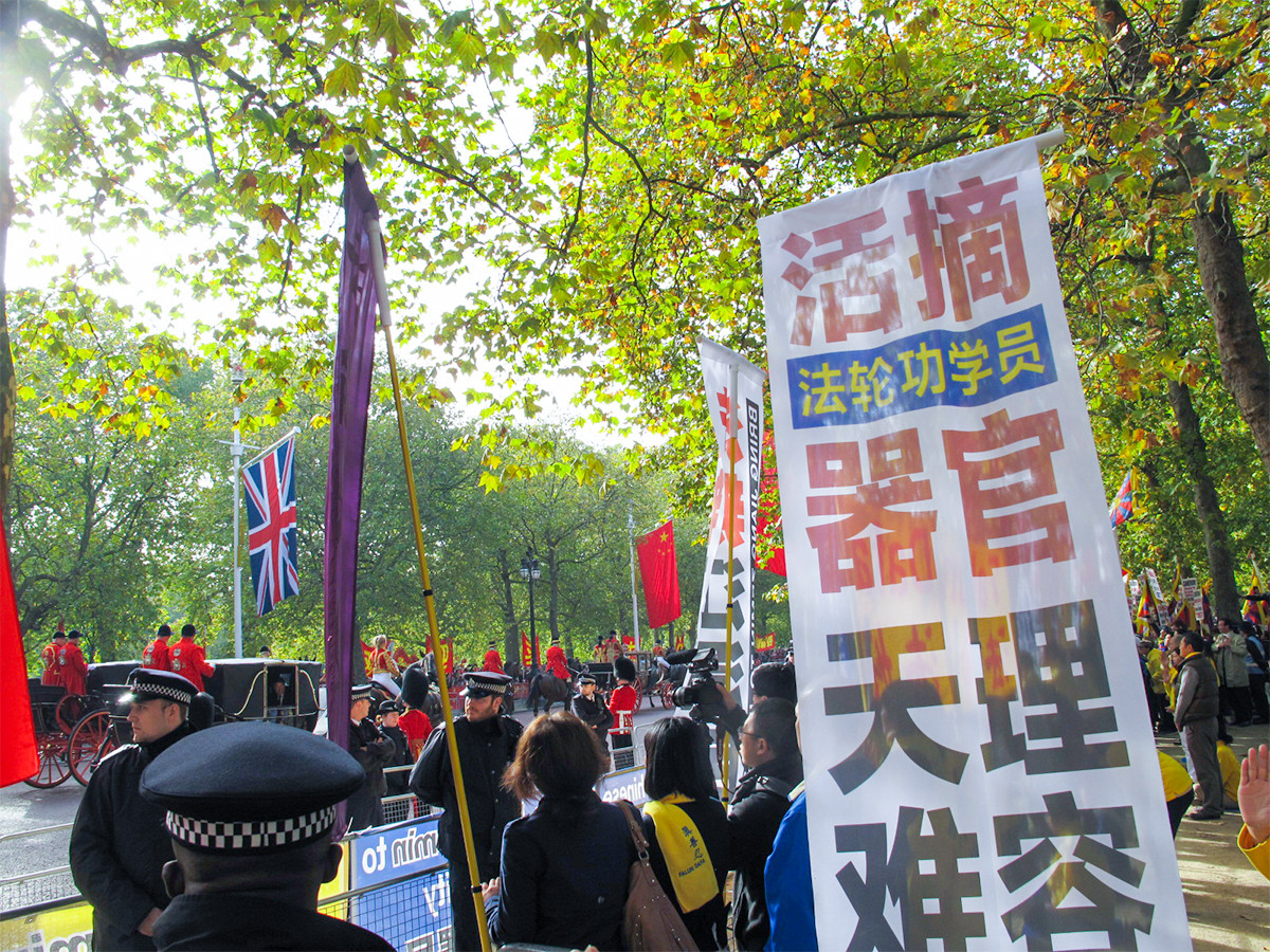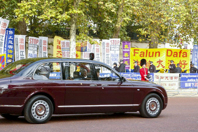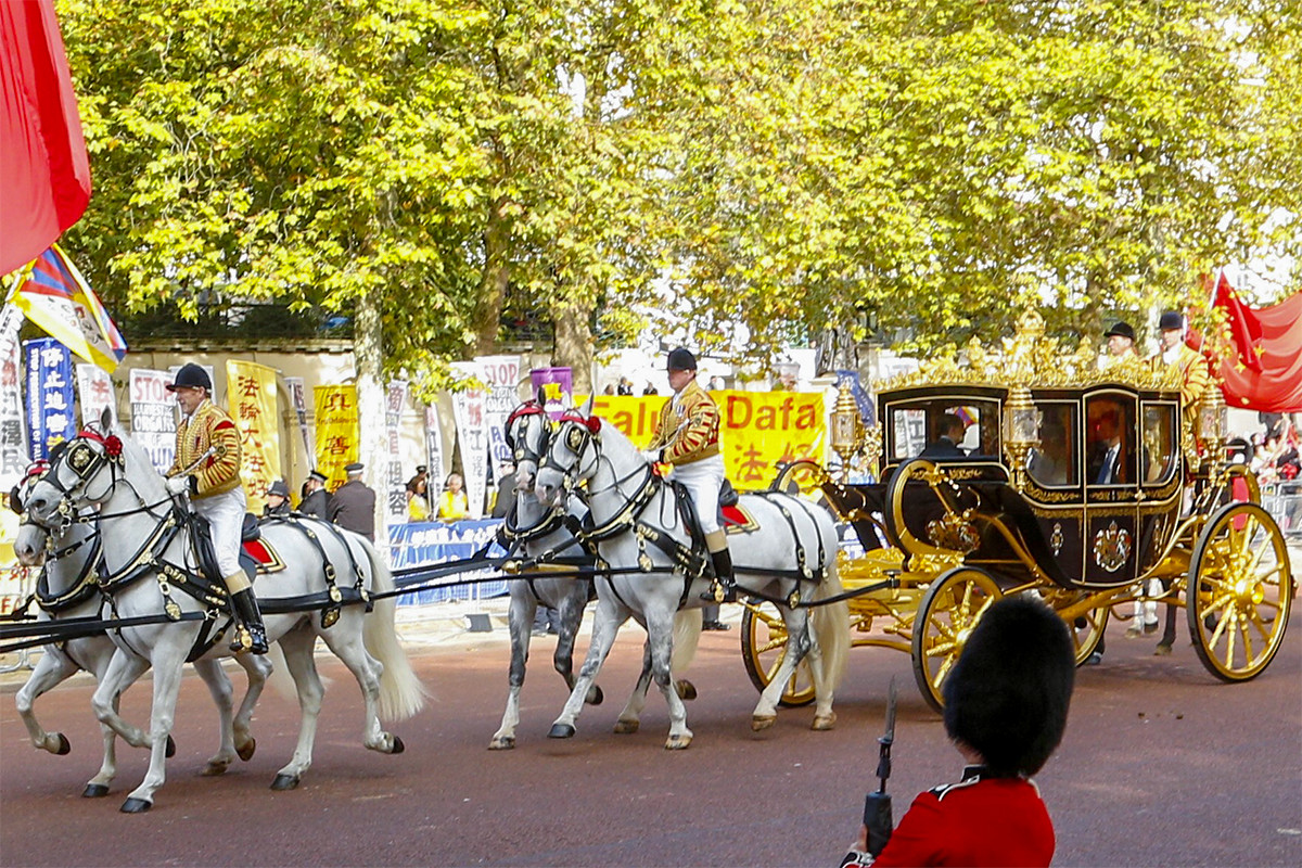 习近平访英活动第一天就遇到了法轮功。与英国女王乘坐金马车行驶在林荫路上,展现在他们面前的如同一个月前访美时所见,那就是“法轮大法好”、“停止迫害法轮功”和“法办江泽民”。