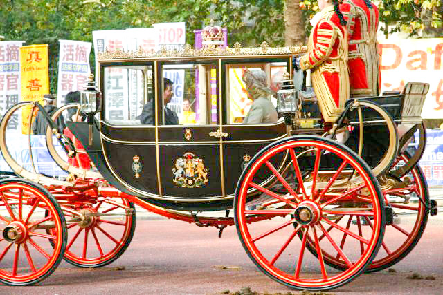 二零一五年十月二十日中午时分,英国女王伊丽莎白二世和夫君爱丁堡公爵乘坐轿车,驶出白金汉宫去迎接习近平一行。法轮功学员看到爱丁堡公爵看到大法真相时面带微笑,还转过脸来向大法弟子招手致意,女王身体前倾,看起来在努力看清真相横幅上写着什么。在民众目光追随女王马车的时候,女王的目光被法轮功真相吸引住了。