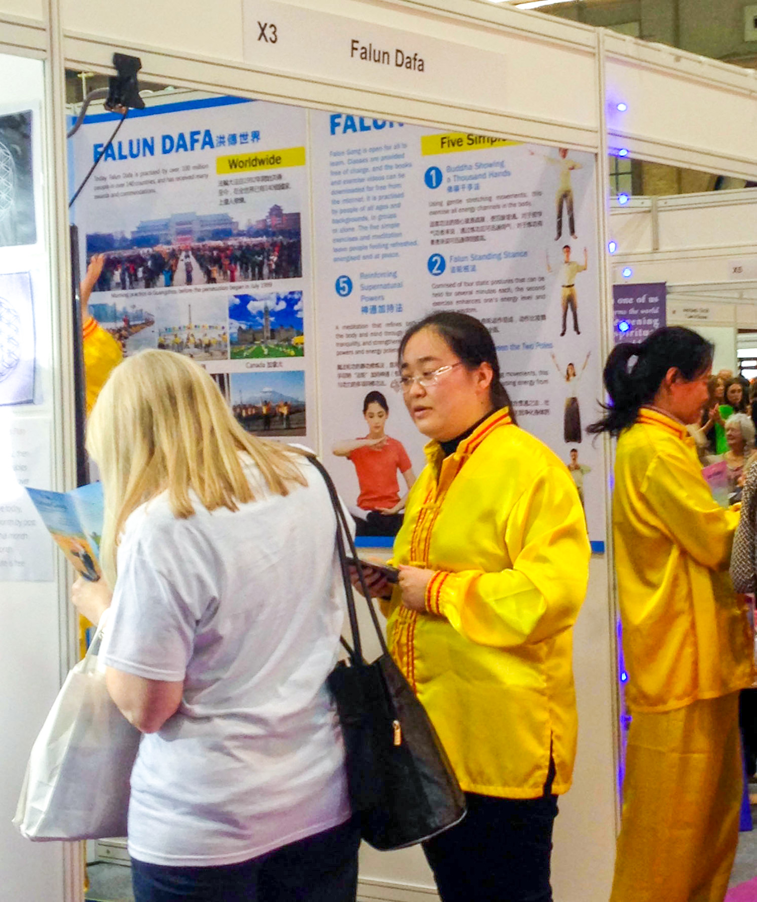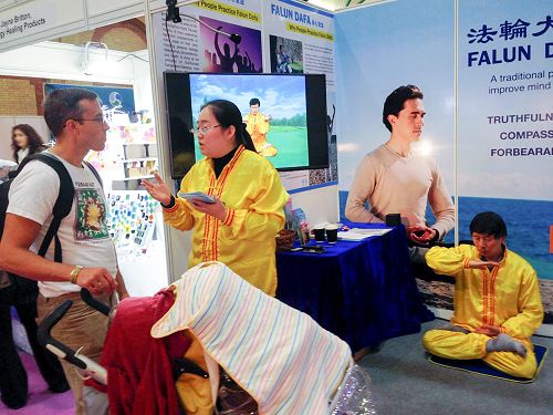 为期三天的博览会热闹繁忙。在展览大厅的几百家参展单位中,英国法轮功学员把展台布置得简洁、明快、电视屏幕中不断播放法轮功教功录像,还有身着金色炼功服的学员伴着祥和优美的音乐炼功。法轮功学员还在不断地发放法轮功真相传单和手工莲花,面对面讲述法轮大法的美好。