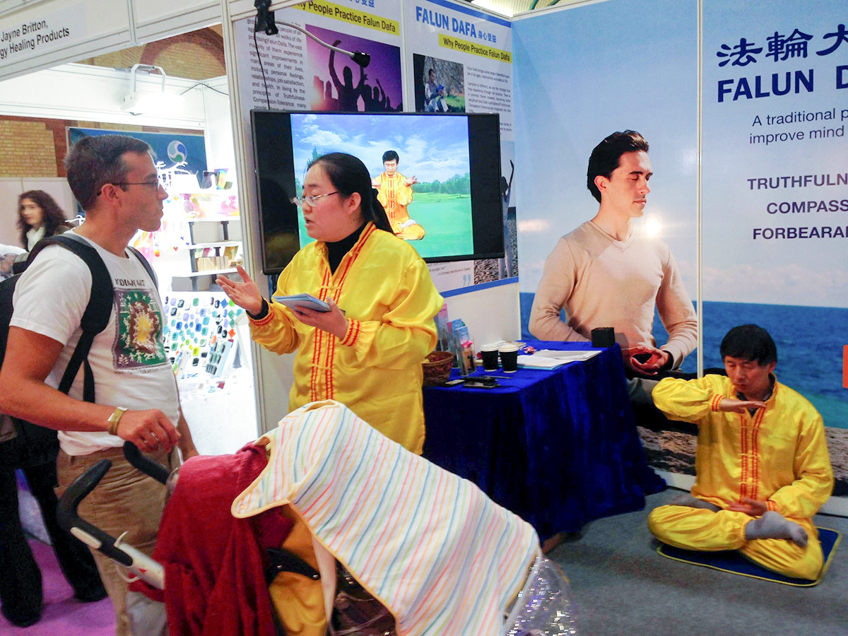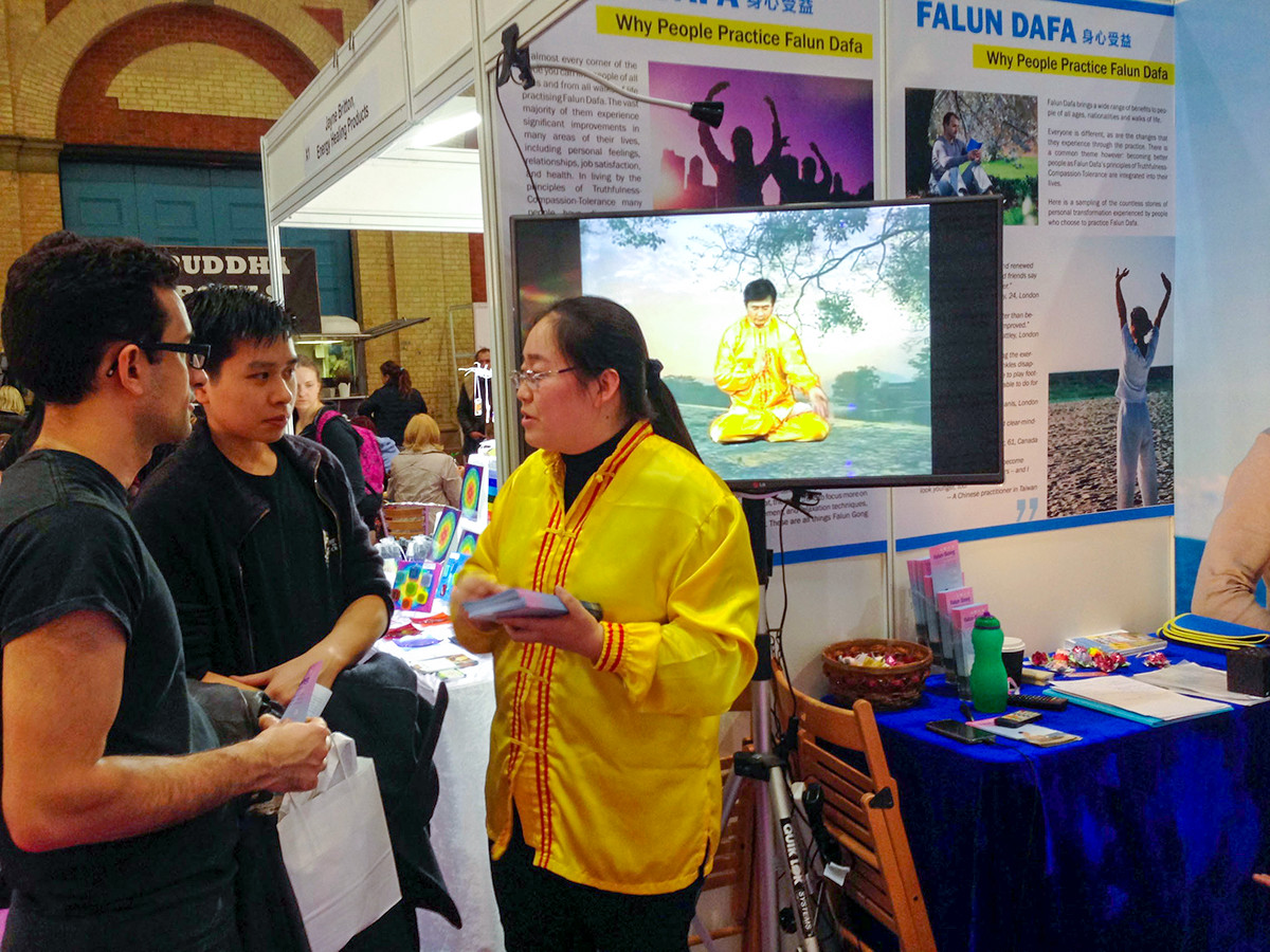 二零一五年十月二十三日至二十五日,他们又在位于伦敦北部的亚历山大宫(Alexander Palace)参加了伦敦“身心灵体验”(Mind Body Soul Experience)博览会,向出席这一盛会的数万人介绍法轮功、展示法轮大法的美好。来到身心健康节的人中很多人对打坐、太极、瑜伽感兴趣,他们当中有很多人愉快地表示他们要去学炼、体验法轮功。