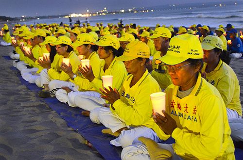 图:印尼学员在海滩上举行烛光悼念活动,悼念在中国被中共迫害致死的法轮功学员