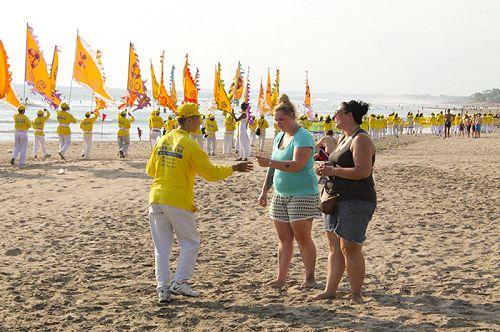 图:上百名法轮功学员组成腰鼓队、锦旗横幅,在长达四公里的乐吉安海滩举行游行