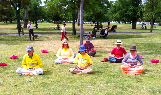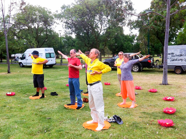![]() 图1-2:墨尔本法轮功学员在首届多元文化全球村节(Global Village Festival)上展示功法。 |