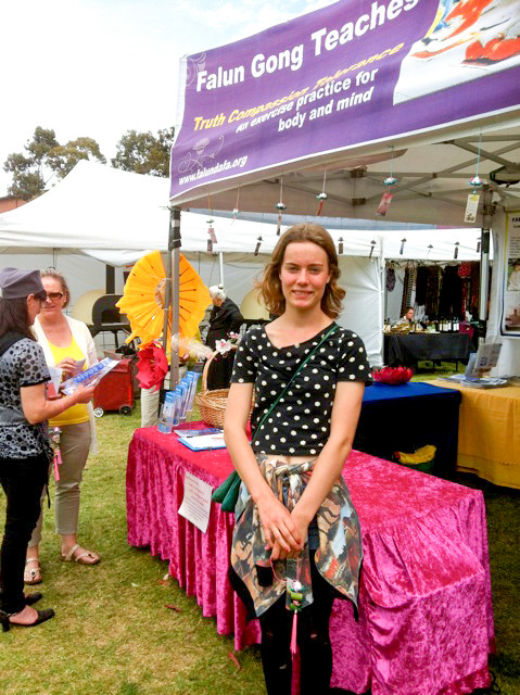 节庆现场有七十多个来自不同族裔、色彩缤纷的展位,伴随热闹的歌舞表演,吸引了众多的游客和市民。当人们经过法轮功学员的展位,从孩子到成年人,不少人认真跟学员学炼五套功法后,还询问了墨尔本各炼功点的详情,表示回去后要继续学炼。