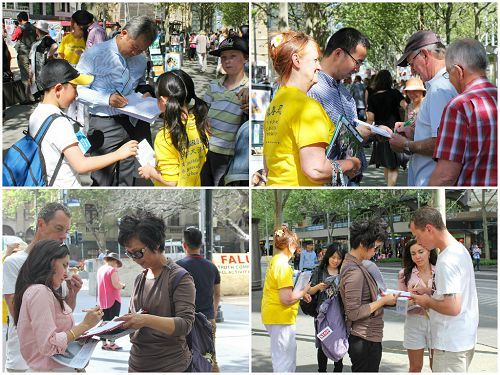 图1-2:澳洲墨尔本民众和游客签名支持法办迫害元凶江泽民,呼吁停止迫害法轮功。