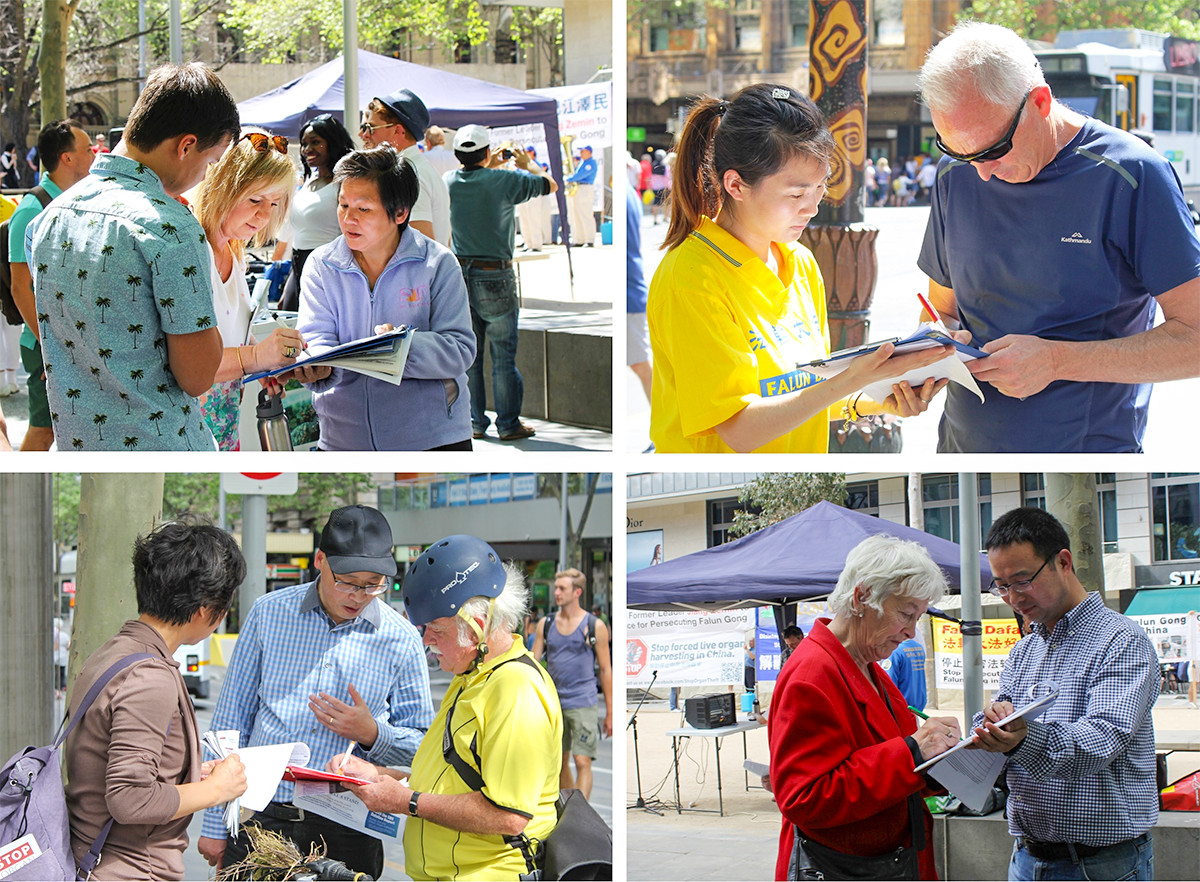 【明慧网二零一五年十月八日】(明慧墨尔本记者站报道)二零一五年十月三日,澳洲墨尔本法轮大法学会在市中心城市广场举行集会,声援控告江泽民大潮。墨尔本当地民众和游客驻足聆听各界嘉宾的发言,从现场的资料和展板上了解到迫害真相,纷纷在征签表上签名,呼吁现任当权者停止迫害法轮功,并呼吁澳洲政府发声制止活摘器官的大屠杀罪行,同时也签名加入全球控诉举报江泽民大潮,支持法办迫害元凶。