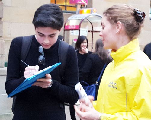 图9:在附近上班的澳洲人迈克尔(Michael A)先生主动签名支持制止“活摘”和声援中国民众控告迫害法轮功的元凶江泽民。