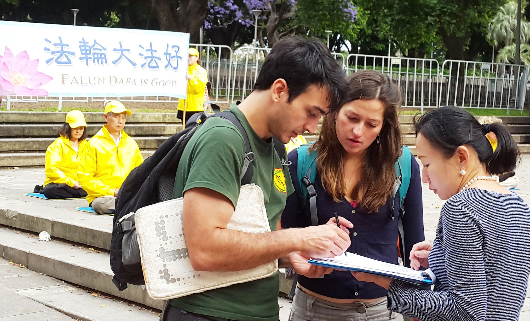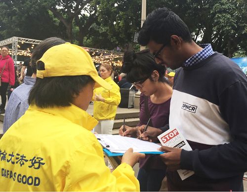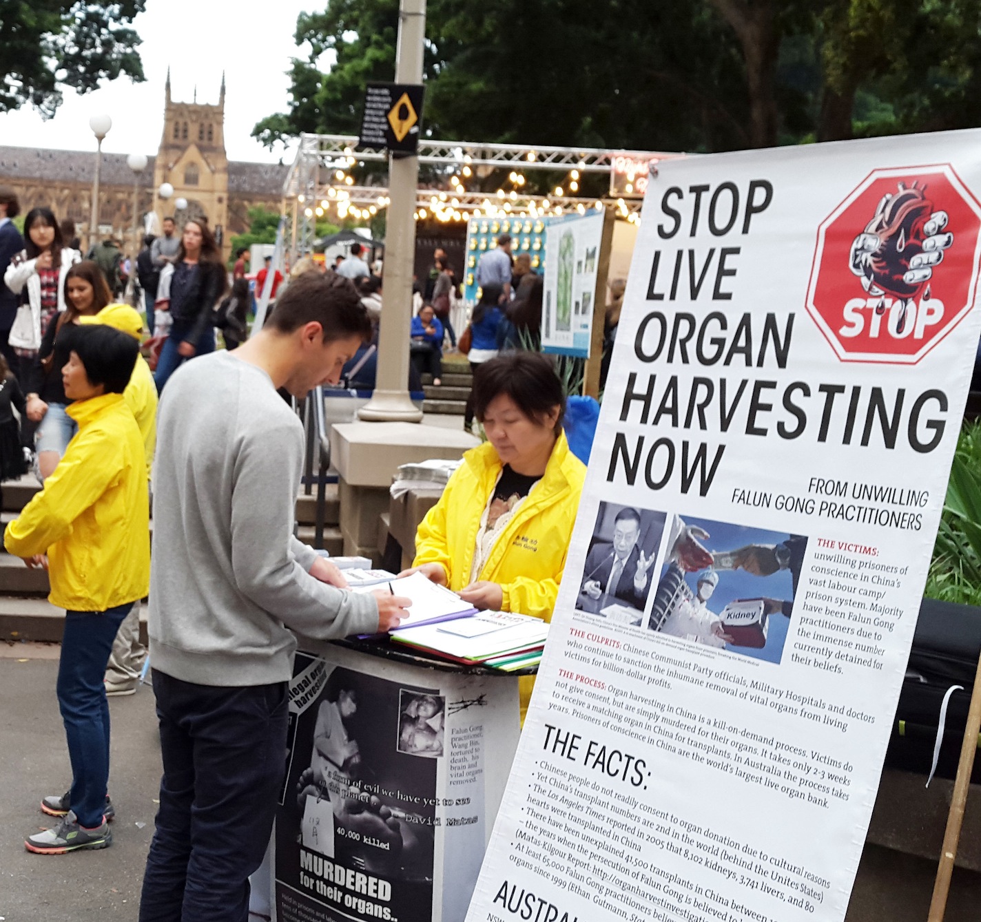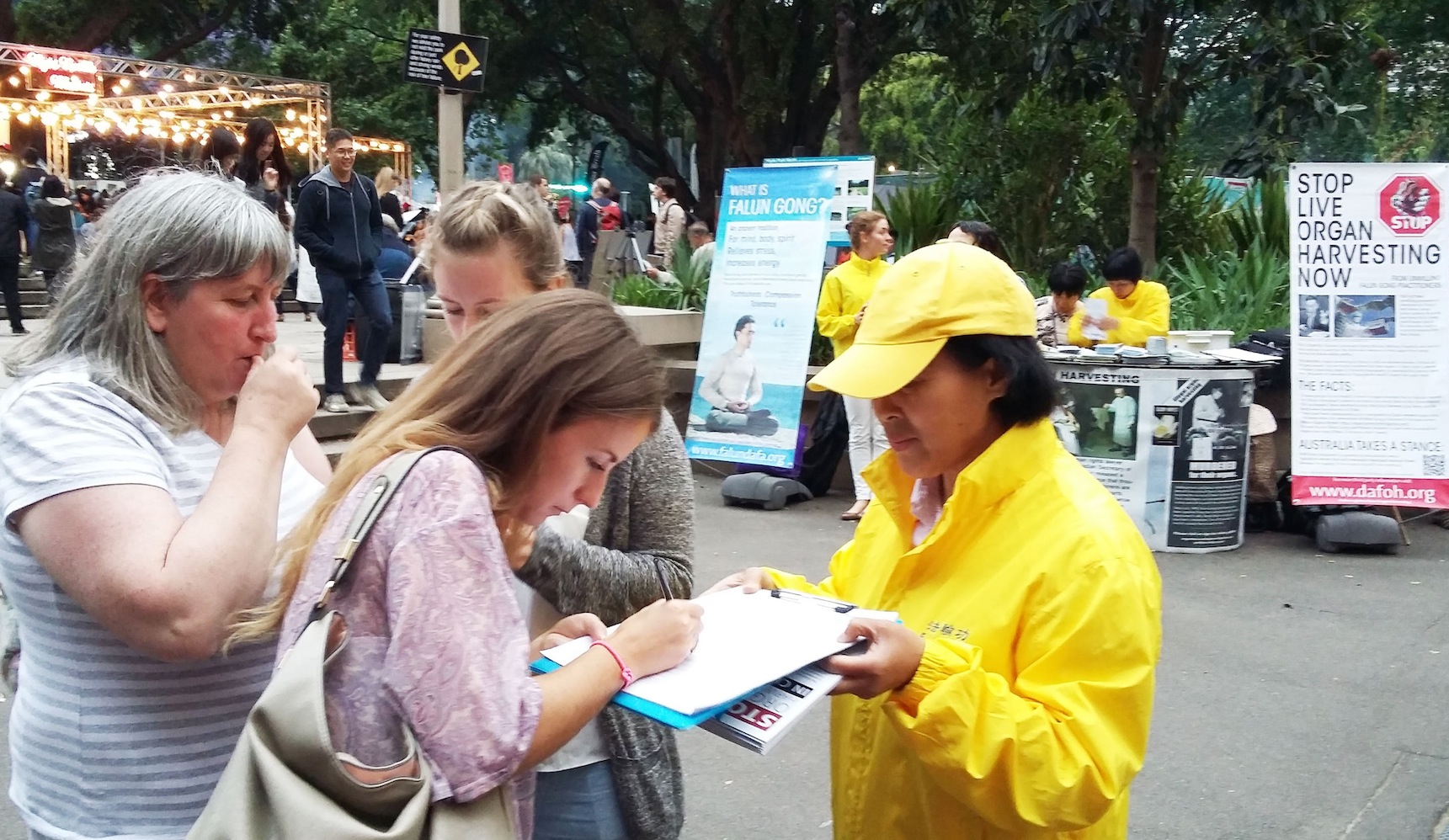 了解真相的悉尼民众正在“制止中共活摘法轮功学员器官和声援中国民众控告迫害法轮功的元凶江泽民的签名表”上签名。