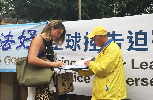 在附近上班的澳洲人迈克尔(Michael A)先生主动签名支持制止“活摘”和声援中国民众控告迫害法轮功的元凶江泽民。