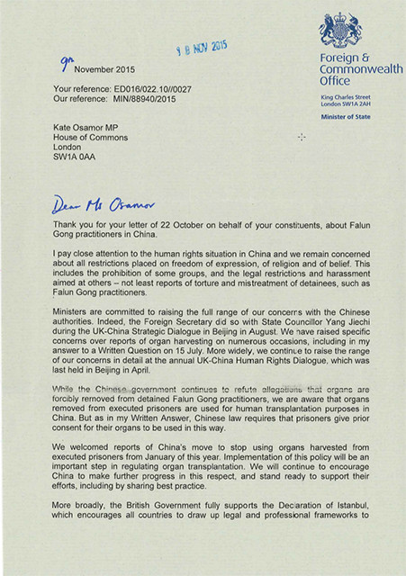 【明慧网二零一五年十一月二十三日】(明慧记者唐秀明综合报道)二零一五年十一月十九日,伦敦法轮功学员高女士收到她所在选区国会议员欧萨莫女士(Osamor)的信,以及该议员随信转来的英国外交国务大臣雨果·施威尔(Hugo Swire,Minister of State of the Foreign and Commonwealth Office)给欧萨莫议员的有关回信。施威尔大臣在信中首先感谢欧萨莫议员代表法轮功学员的来信,并郑重表示英国政府持续关注中国人权问题,包括对中共活体摘取法轮功学员器官的指控。