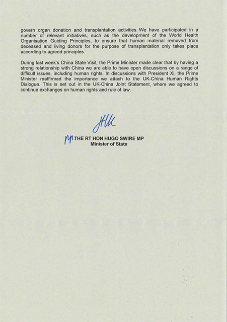 “英国外长们致力于向中共当局提出了我们的这些关注。事实上,在今年八月于北京举行的‘中英战略对话’上,英国国务卿(state secretary)向中共外长杨洁篪提出了这些关注。我们在很多场合提及有关活摘器官的报告,包括今年七月十五日我就书面问题(Written Question)的一次回答。另外,在每年举行的‘中英人权对话’会谈上,我们继续详细地提出我们的关注,最近的一次会谈于今年四月在北京举行。”