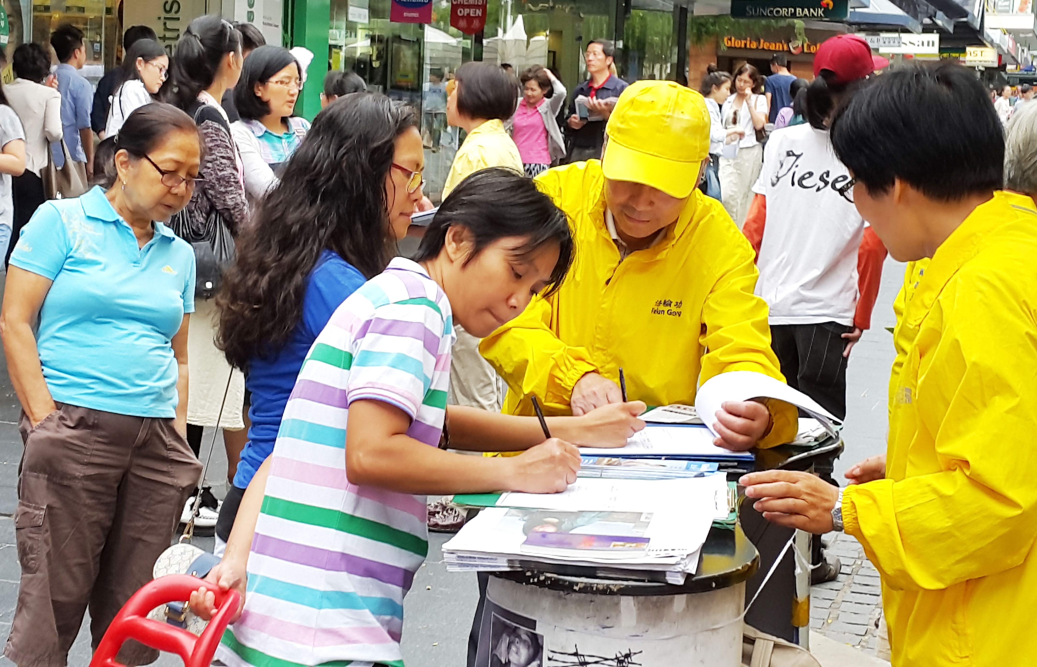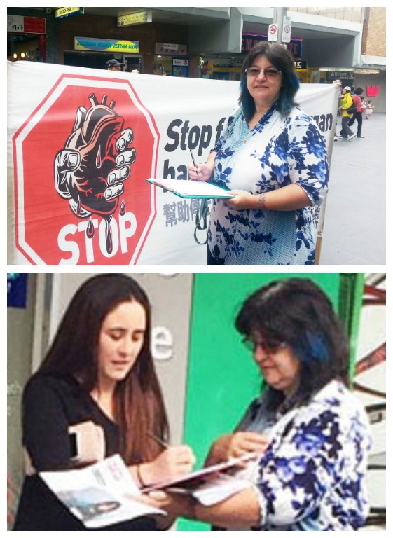 图1:皮尔森女士(Sheree Pearson)正在请悉尼市民签名制止“活摘”