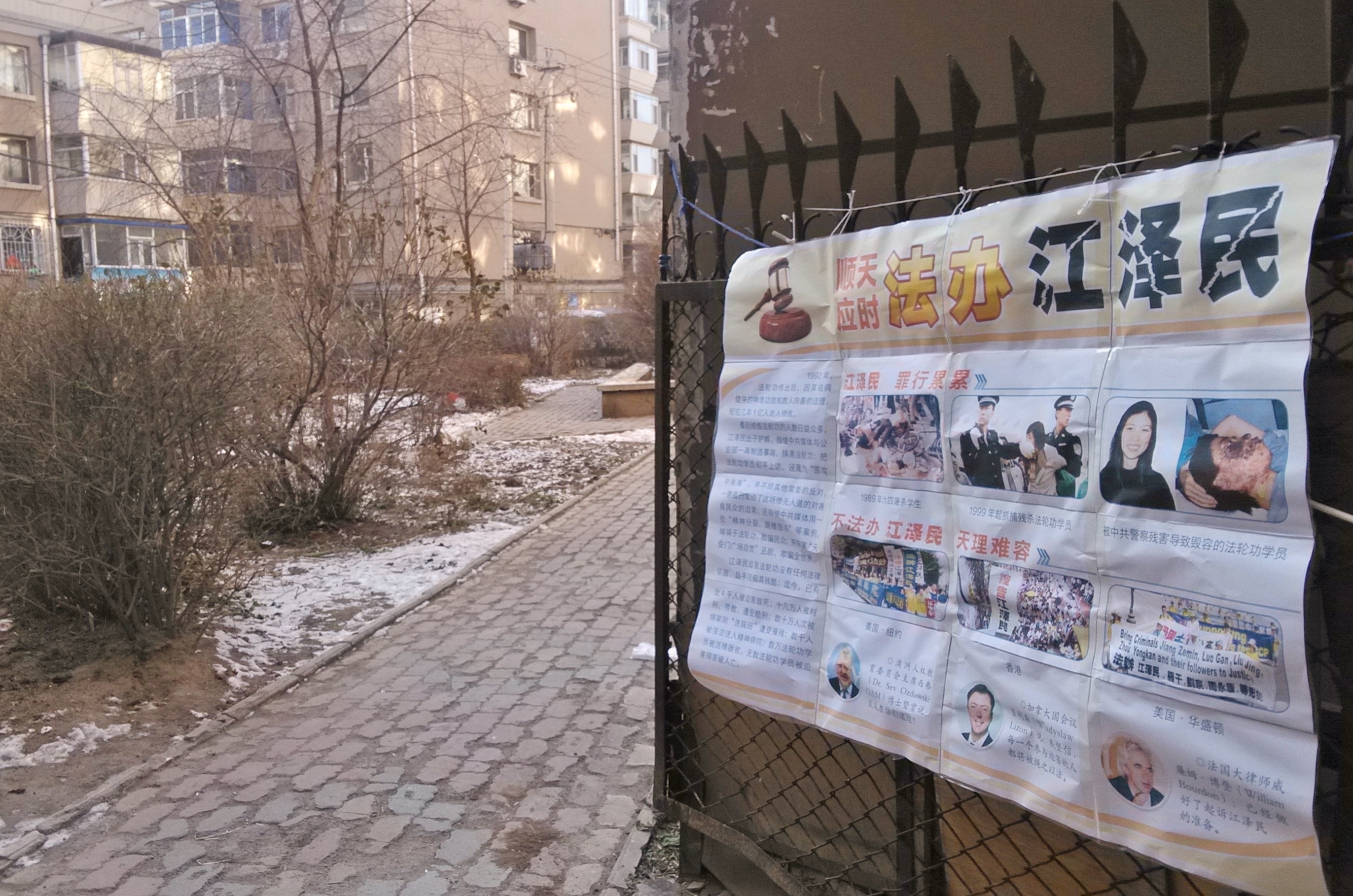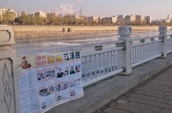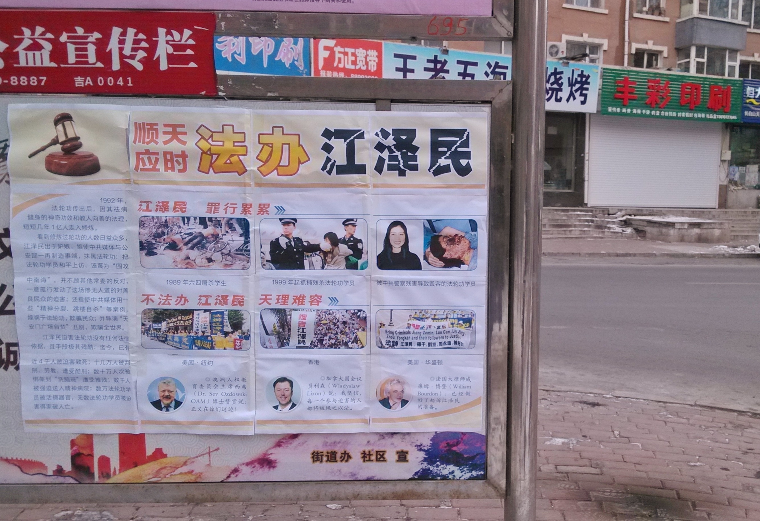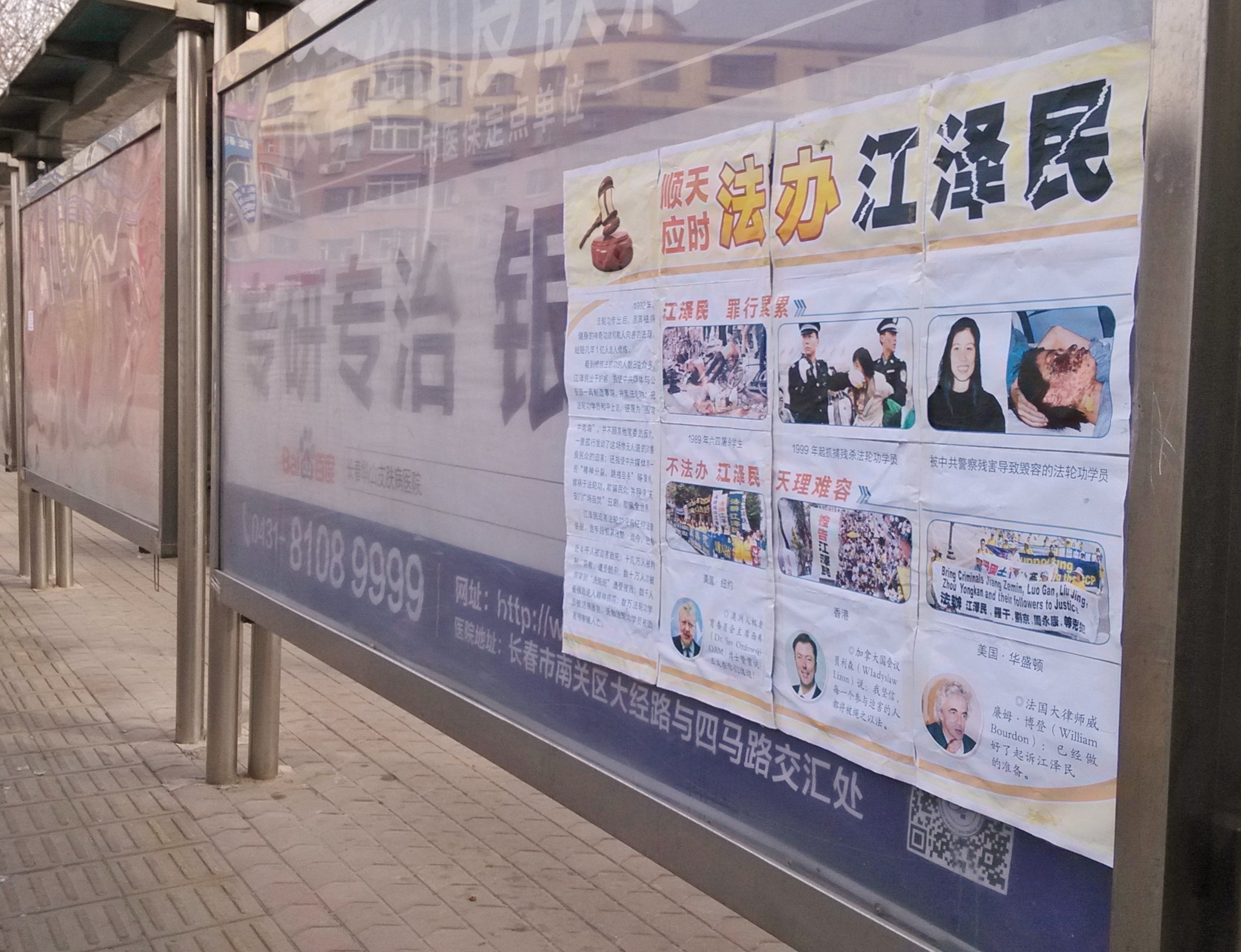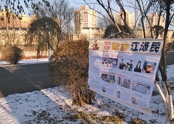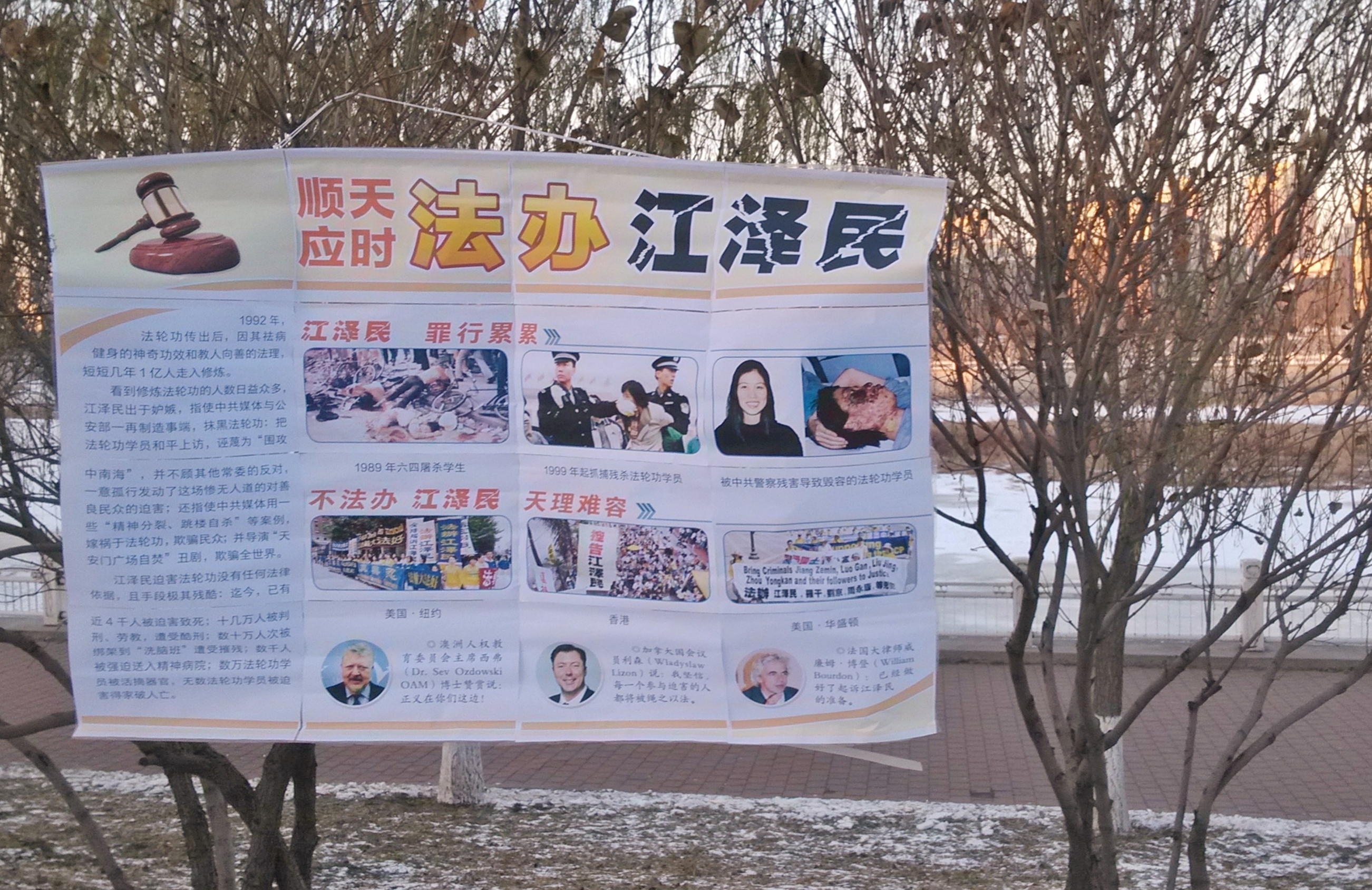 通讯员长春报道)由十六张A4纸组合的诉江展板,出现在长春的各公交站台、伊通河畔、居民小区及林荫小路,展板向长春百姓历数着中共恶首江泽民的罪恶,吸引着过往行人驻足观看,并唤醒着人们的良知。