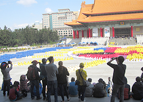 - 台湾大型排字 法轮功吸引中外游客(图)- 六千三百多名法轮功学员在台北自由广场排出“法轮图形”及“法轮常转”四字图像。壮观场景更深刻地震撼了中国大陆游客。