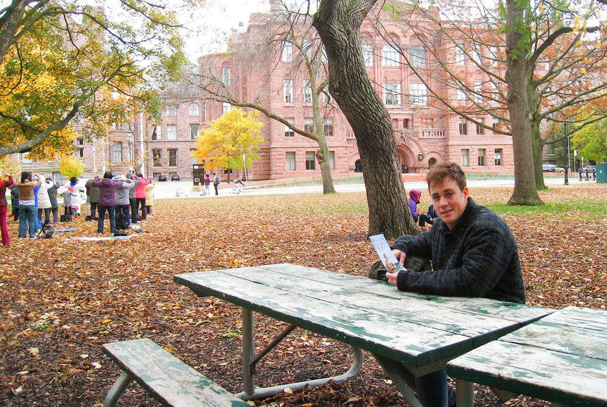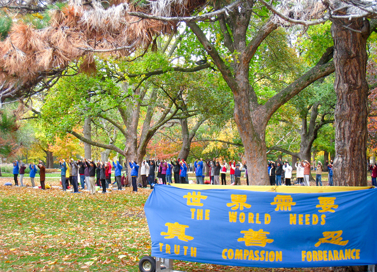 ![]() 图3:卡尔顿大学的大学生Sam Rubimosi先生坐在长凳上观看法轮功学员的集体炼功。 |