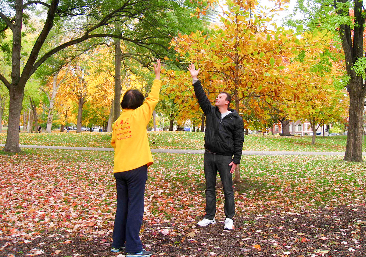 Valeri Oparychue先生来自于俄罗斯,现在多伦多市一家房地产公司作经纪人。当看到法轮功学员集体炼功的场面,就在炼功队伍后面模仿学员的炼功动作。学员看到后就过去教他,Oparychue先生学得很认真,学炼完第三套功法后,他说:“我感到非常兴奋,因为法轮大法让我感受很深,他会帮我改善我的精神状态并让我取得进步。我非常想修炼法轮功。”