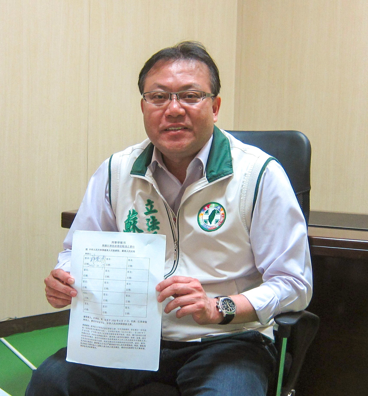 ![]() 图1:一向支持法轮功反迫害的立法委员苏震清,得知诉江大潮后,义不容辞,立即签署举报书。 |