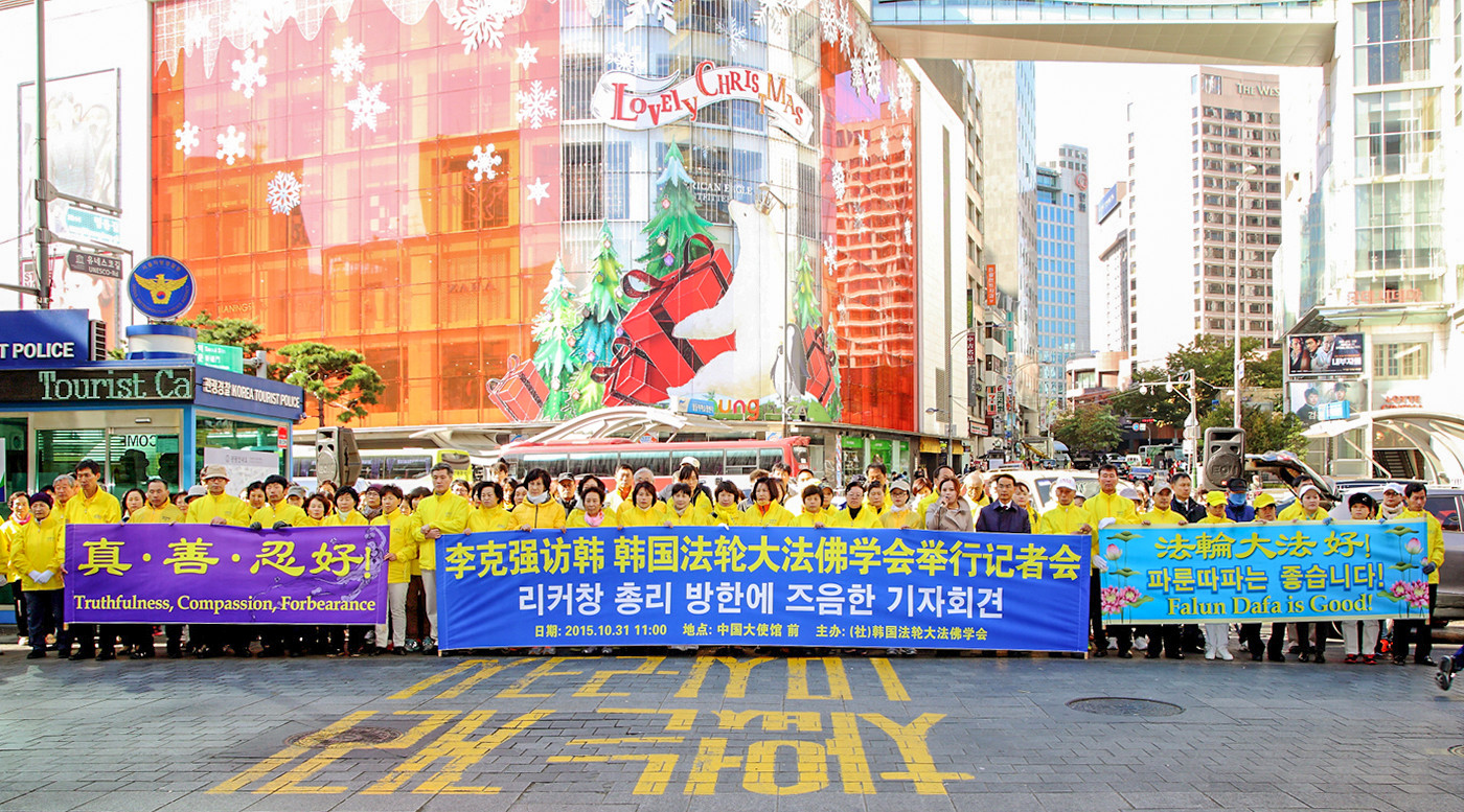 【明慧网二零一五年十一月五日】二零一五年十月三十一日,在中国总理李克强访韩之际,韩国法轮大法佛学会在首尔中共大使馆前召开记者会,告诉公众目前的诉江大潮,同时呼吁驻韩中使馆官员认清形势,再也不要做中共帮凶。