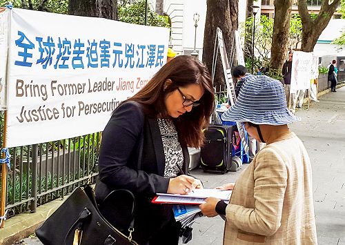 ![]() 图5:威廉(William Doclins)在真相横幅前驻足看了好久,签名后表示,“活摘”太惨不忍睹,独裁者江泽民应该尽快被绳之以法! |