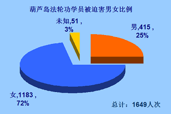 从1649名被迫害的法轮功学员总数中,按性别比例:男性415人次,占25%;女性1183人次,占72%;其中51人性别未知,占3%。女性占大多数。