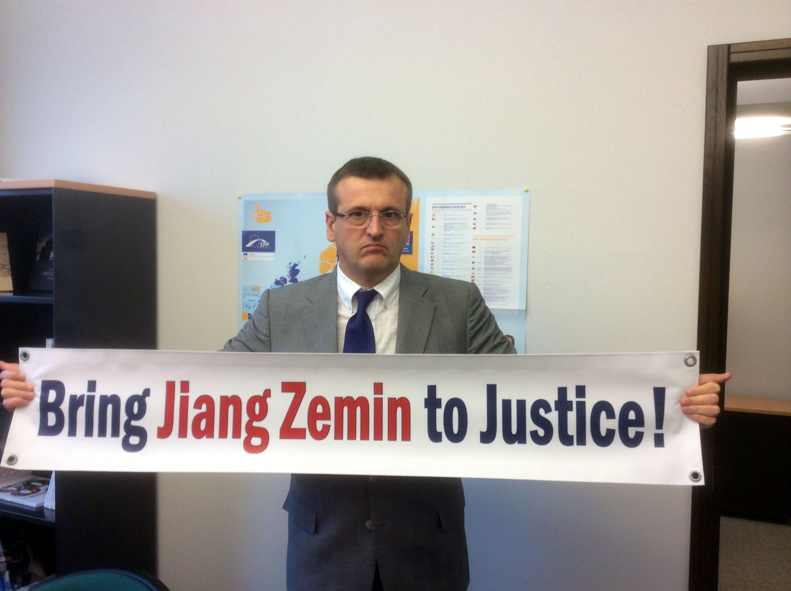 ![]() 欧洲议会议员克里斯蒂安•旦•培瑞达 (Cristian Dan Preda)手举“法办江泽民!”的横幅 |